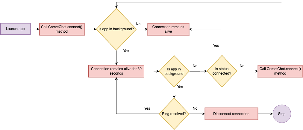App in foreground | Call CometChat.connect() to create the WebSocket connection |
